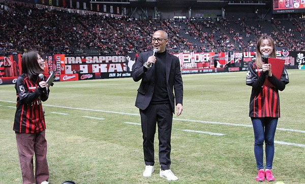 上写真/昨年引退し札幌のO.N.O(One Hokkaido Nexus Organizer)に就任していた小野伸二氏が来場、ホーム開幕戦前のピッチに登場、ハイジ(左)と木下遙(右)のインタビューを受けた。