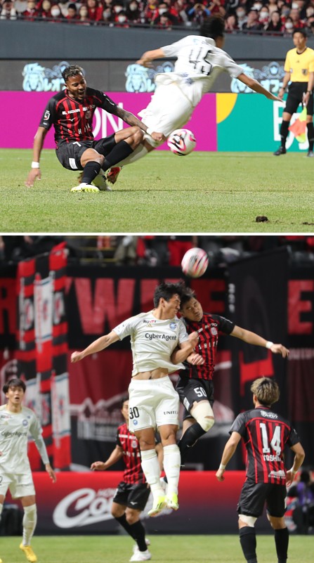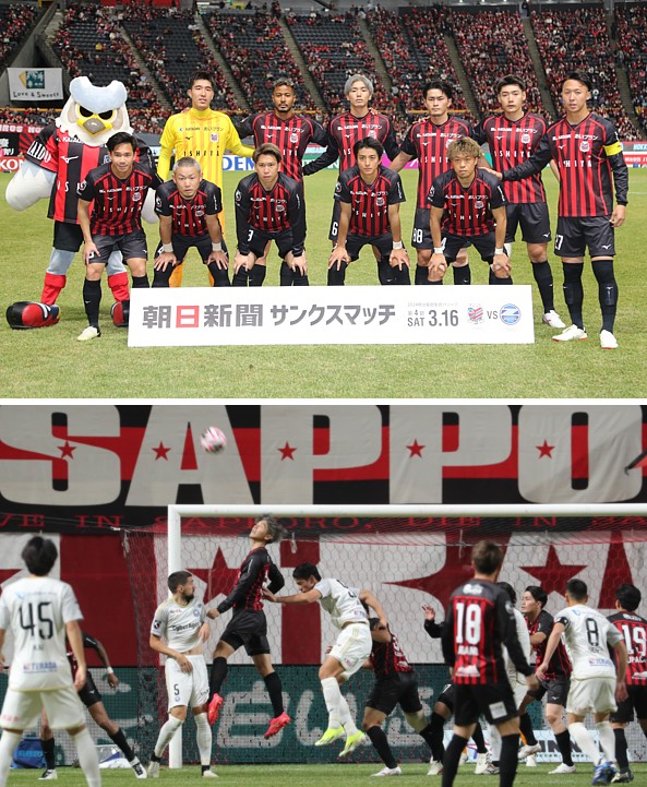 上:下段写真/前半5分、GKからのロングボールをヘッドで奪い合う札幌DF岡村(50番)と町田FWオ・セフン、右手前札幌MF駒井(14番)
