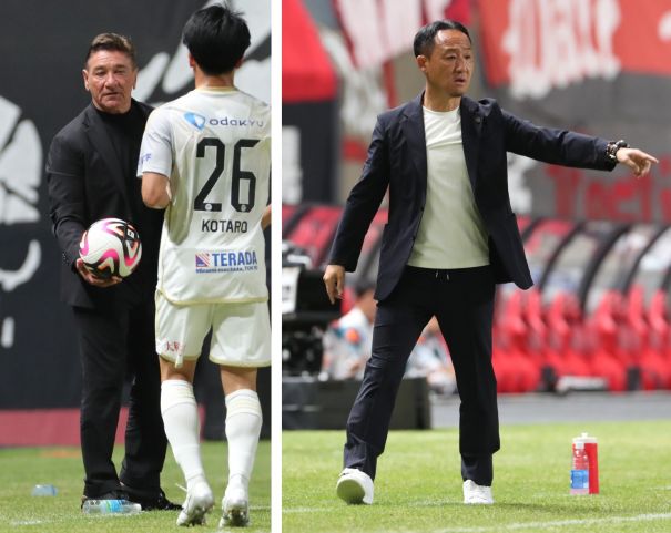 上:左側写真/前半24分、自分の所に飛んで来た町田ボールをロングスローのスペシャリストMF林(26番)にトスする札幌のペトロビッチ監督