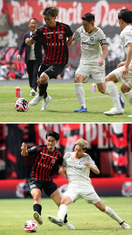 上:上段写真/前半5分、左サイドを駆け上がる札幌MF駒井(左)に襲いかかる町田キャプテンMF仙頭
