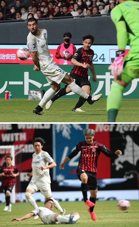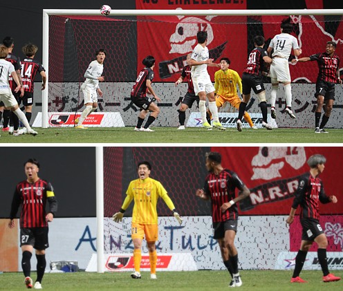 上:上段写真/後半追加タイム6分、札幌はMF原(35番)、DF中村(6番)、FW鈴木(7番)がゴール前に攻め込むが、MF安井(41番)、林(26番)、FWミッシェル・デューク、MF柴戸(45番)、下田(18番)らの堅い守りに得点できず