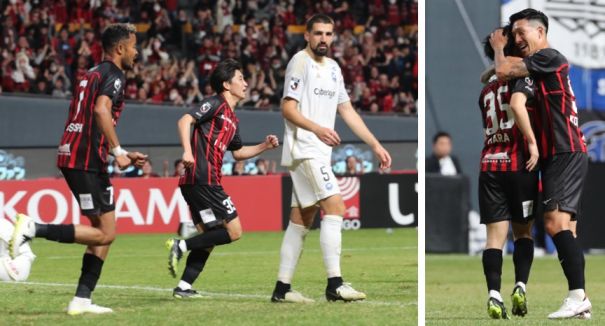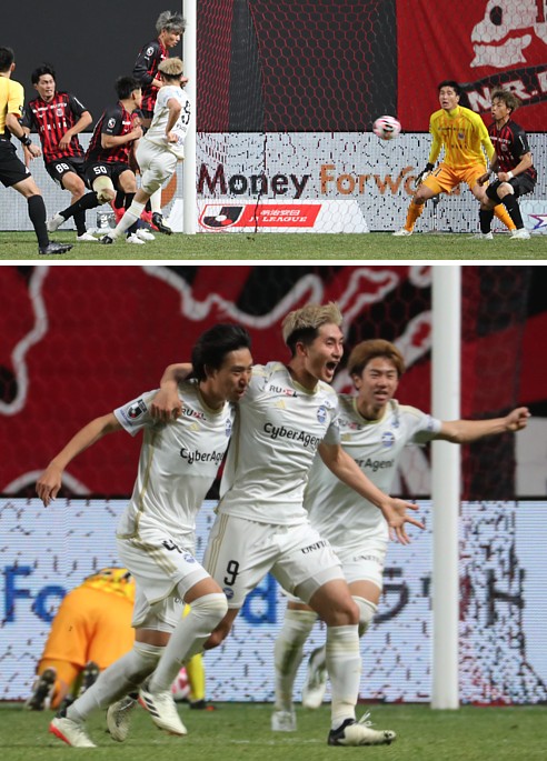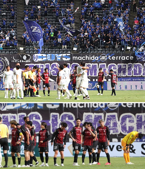 上:上段写真/札幌を破り抱き合って喜ぶ町田の選手たち(手前)とスタンドのサポーターは歓喜、札幌の選手たちがガックリとうつむく