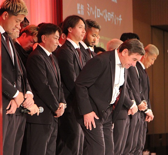 上写真/感謝の集いで、J2転落を詫びるペトロビッチ監督。選手たちの表情も一様に硬い