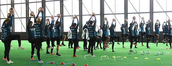 2025年シーズンをJ2で戦う北海道コンサドーレ札幌が6日朝、大和ハウス プレミストドームの片隅に人工芝を張った“特設ピッチ”で始動した。この日は他の催し物会場の設営で全体を使えない為だった。