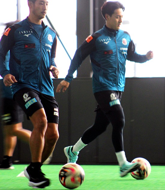 上写真/昨年途中の入団で不完全燃焼のバカヨコ(左)と期限付き移籍から戻った中島がFW同士で話し込む