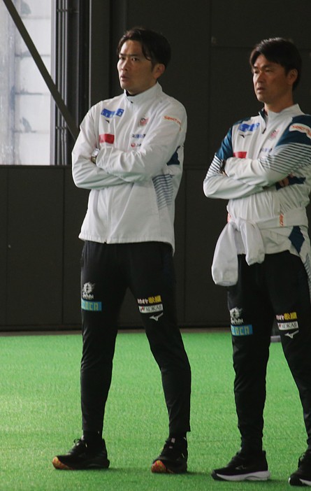 上写真/選手たちの動きを見守る岩政大樹新監督(左)