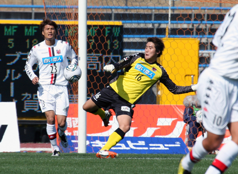 上写真/前半16分、先発に起用され奮闘する韓国から新加入のGK李昊乗(16番)、その左DF山下(23番)