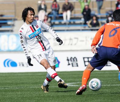 上写真/今季は練習生からスタート、開幕直前に契約して先発に起用されたDF西村(29番)、前半37分、愛媛MF田森(6番)をかわしてパスを出す