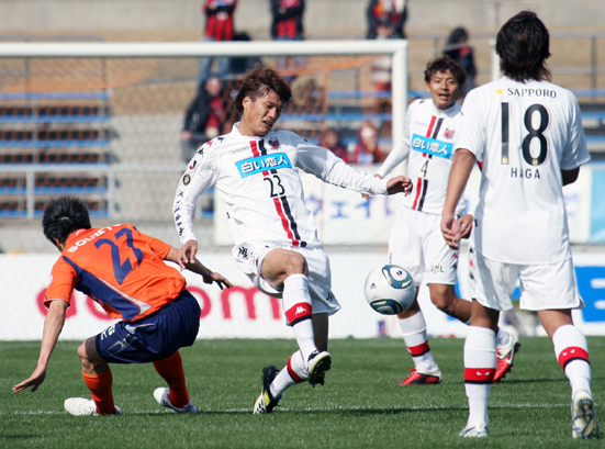 上写真/後半45分、愛媛FW齋藤(27番)からボールを奪い攻めあがる札幌DF山下(23番)、その右同河合(4番)、右端(18番)はMF芳賀
