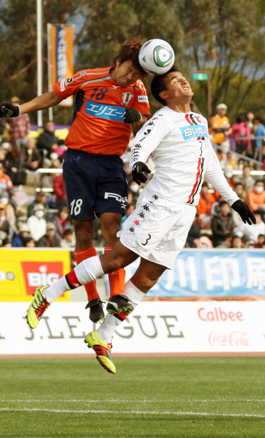 後半ロスタイム試合終了直前、愛媛DF池田(18番)とヘッドで競り合う新加入の札幌チアゴ(3番)