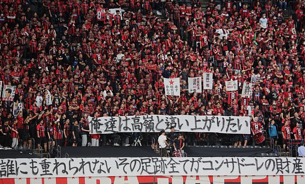 上写真/サポーターから「俺達は高嶺と這い上がりたい」の横断幕が掲げられた。高嶺にチームに残ってもらいたいという願望か?