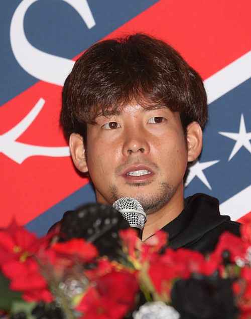 上写真/セレモニー後の引退会見に臨む深井