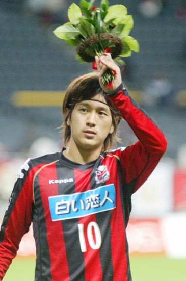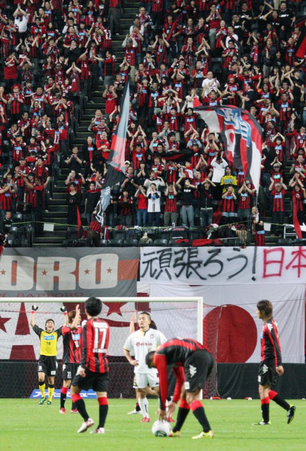 上写真/今季チーム初得点を決め、初勝利に貢献してヒーローとなった札幌のMF宮澤がサポーターの祝福に応える