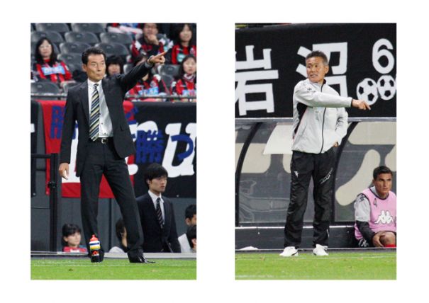 上写真/後半28分それぞれ自軍の選手を鼓舞する草津の副島監督(左)と札幌の石崎監督(右)。