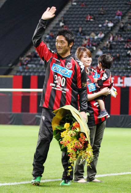 上写真/前節の熊本戦で300試合出場を達成した札幌MF砂川は記念のシャツを奥さんとお子さんに手渡され、うれしそう
