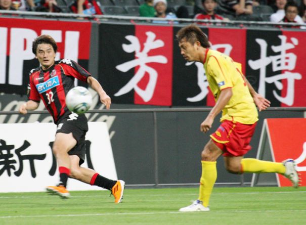 上写真/後半26分右サイドを駆け上がった札幌MF近藤(32番)が絶妙のクロスを上げる。右は北九州DF福井