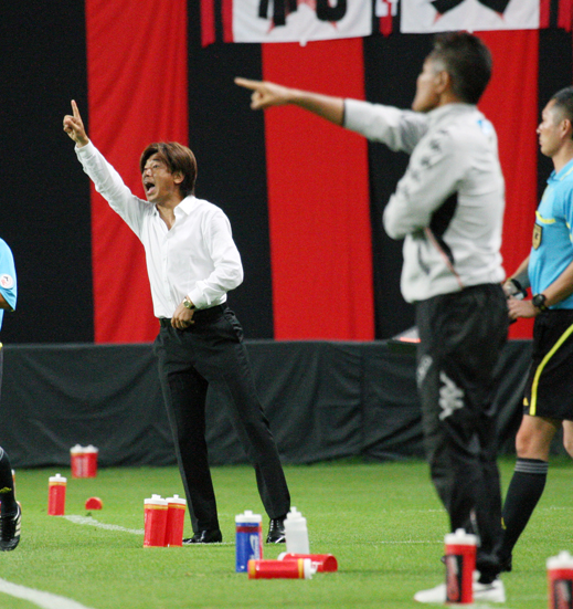 上写真/後半28分緊迫した攻防に北九州の三浦泰年(左)、札幌の石崎信弘両監督が必死の采配