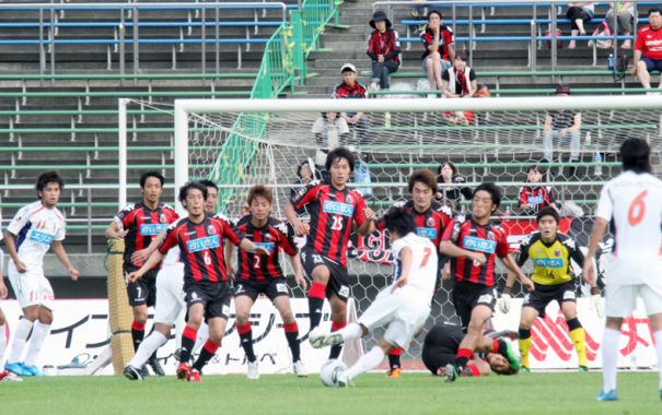 上写真/後半8分札幌ゴール正面での愛媛FCのMF大山(左端)のFKは壁となった札幌MF河合(4番)の腹を直撃する。札幌の壁、左からMF高木(純)、DF岩沼(6番)、日高(2番)、櫛引(25番)、FW近藤(32番)、MF砂川、後方にGK李