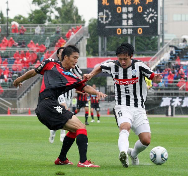 上写真/前半31分札幌DF山下(左)と水戸MF西岡が長い距離を走るマッチアップ、札幌のCKとなる。山下の頑張りがこの後のCKからのFW内村の先制点につながった