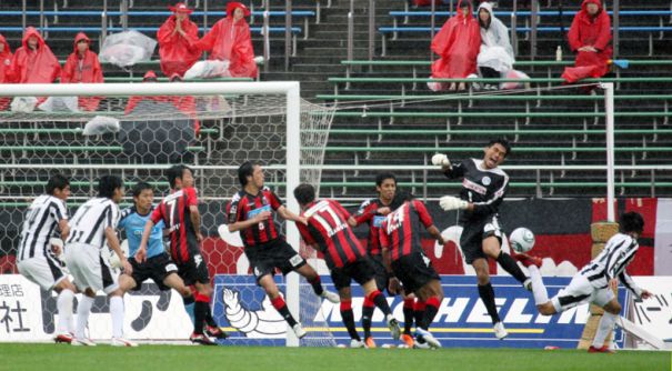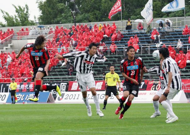 雨が降る中での試合となったが、両チームともアグレッシブなプレーを立ち上がりからみせた。前半32分、右からのCKをMF宮澤が中央に折り返すと、素早く反応したFW内村が左足に当ててゴールに流し込み先制。