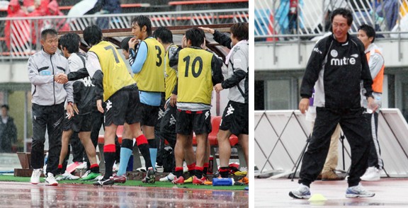 上:左写真/2−1と勝利したにもかかわらず、ベンチの選手と握手はしたもののニコリともせず引き上げる札幌の石崎信弘監督