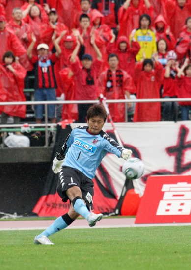 上写真/前半9分初出場の札幌GK高木(貴)が大きくボールを蹴る。かつて札幌がJ1昇格したときの正GKだったが今季再加入。同点ゴールを決められたときは苦笑いだったが、試合終了後は笑顔を見せていた