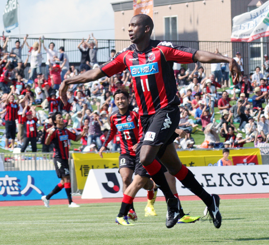 上写真/後半2分同点ゴールを決め“カラスポーズ”で喜ぶFWジオゴ(11番)とゴールの起点となったMF内村(13番)が走り寄る。左奥はDF上原(26番)
