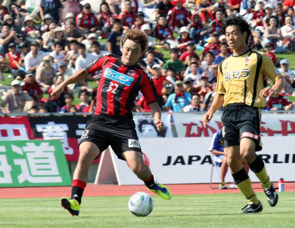 上:右写真/後半32分「さて、これからどうする?」若い横野、三上の投入を思案する札幌の石崎信弘監督