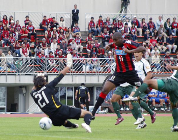 上:下段写真/前半21分栃木の猛攻を札幌GK李吴乗が腕を伸ばして好セーブ、左は栃木FWロボ(9番)、李の手前は札幌DF山下(23番)