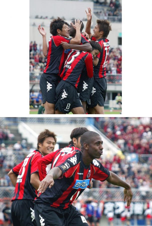 上:下段写真/先制点を決めおなじみになったカラスのポーズをする札幌FWジオゴ、左は笑顔のDF山下