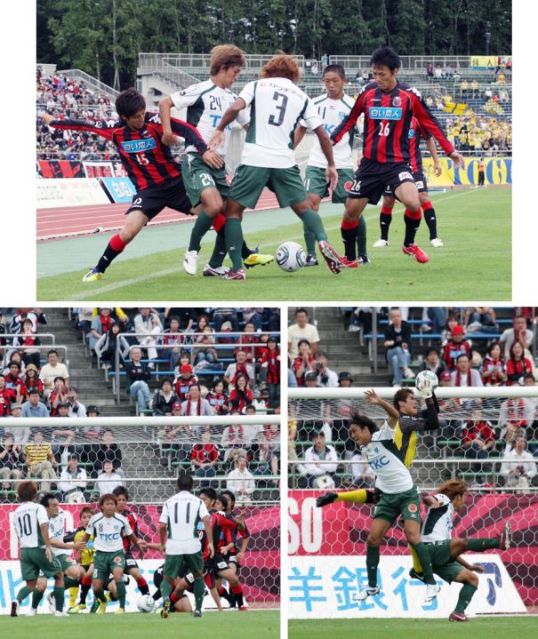 上:下段左写真/後半45分札幌ゴール前での栃木の猛攻、一瞬同点かと思うほどの危ないシーンだった。左から栃木MF高木(10番)、FWロボ(9番)、札幌GK李(16番)、栃木MF廣瀬(8番)、札幌MF古田、栃木FW河原(11番)、札幌MF宮澤