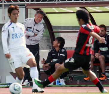 上写真/後半38分札幌の石崎監督は赤池GKコーチと打ち合わせ中、目前の札幌MF砂川(右)と徳島MF徳重(7番)のベテラン同士のマッチアップに視線を向ける
