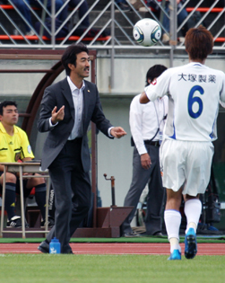 上写真/前半40分指示を出していた徳島の美濃部監督の前にボールが出て、それをキャッチしてDF西嶋(6番)にトス