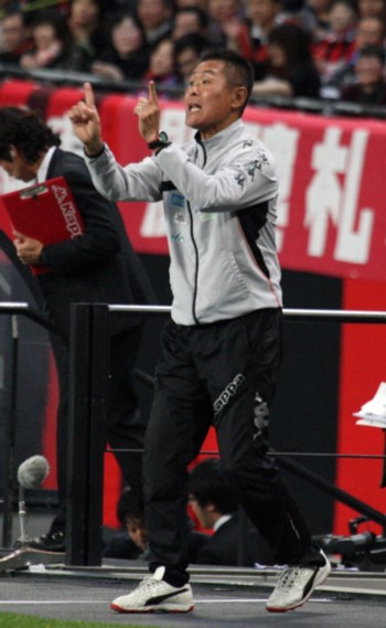 上写真/後半32分両手の指を立てながら懸命に指示を出す札幌の石崎信弘監督