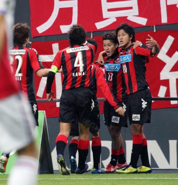 上写真/前半40分先制ゴールを決めたコンサドーレ札幌のMF内村(右から2人目、13番)と祝福する宮澤(10番)、アシストしたMF古田(15番)、キャプテンMF河合(4番)、FW近藤(32番)が走り寄って行く