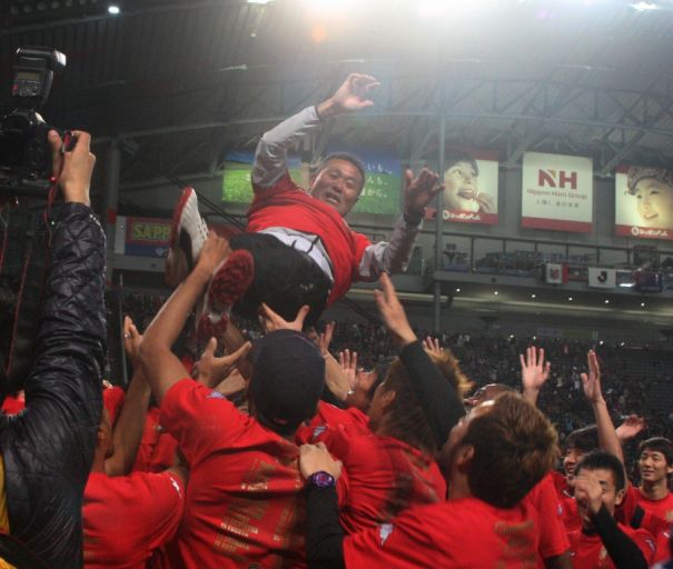 上写真/J1昇格を決めゴール裏サポーター席の前で、選手たちに胴上げされる札幌の石崎信弘監督