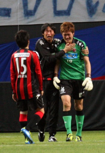 上写真/東京を破ってJ1昇格が決まった瞬間、健闘を見せた札幌のGK李吴乗(16番)が嬉し泣き、たたえる岡山の目も真っ赤。古田(15番)が近寄っていく