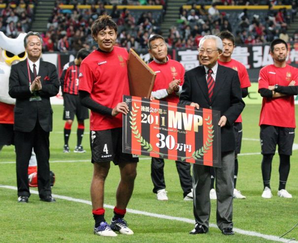 上写真/J1昇格を決め後援会が選ぶMVP賞を元道知事の堀達也会長から受けるキャプテン河合(4番)