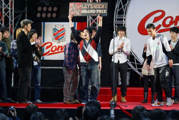 上写真/公式サポートソングに札幌の4人組バンド、「ナイト de ライト」の「終わらない夢」が選ばれた。右はプレゼンターを務めたFW中山、左は審査員を務めた元コンサの選手でアドバイザリースタッフの曽田雄二さん