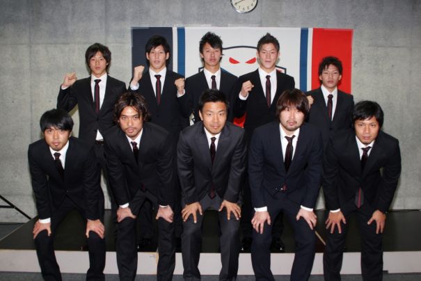 上写真/新加入した選手たち。前列左からMF山本真希、GK杉山哲、FW大島秀夫、前田俊介、MF高柳一誠、後列左からDF前貴之、小山内貴哉、MF荒野拓馬、DF奈良竜樹、FW榊翔太(DFジェイド・ノース、松尾直人の2選手は、この日参加していない)
