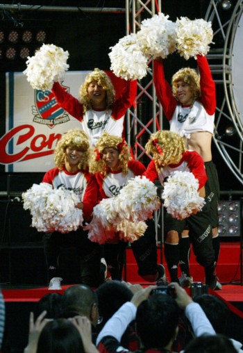 上写真/コンサドールズの扮装でダンスを披露したU−18から昇格した5人組。前列左からDF奈良、前、FW榊、後列左からMF荒野、DF小山内