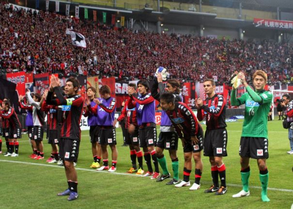 上写真/4年ぶりJ1復帰の開幕戦で強豪ジュビロ磐田と引き分け、やれやれといった表情で25,000人を超える観客にあいさつするコンサドーレ札幌の選手たち。左手前キャプテンMF河合(4番)、右からGK李昊乗(16番)、新加入DFノース(3番)、FW大島、控えGK杉山ら