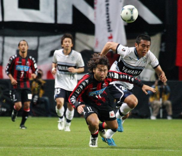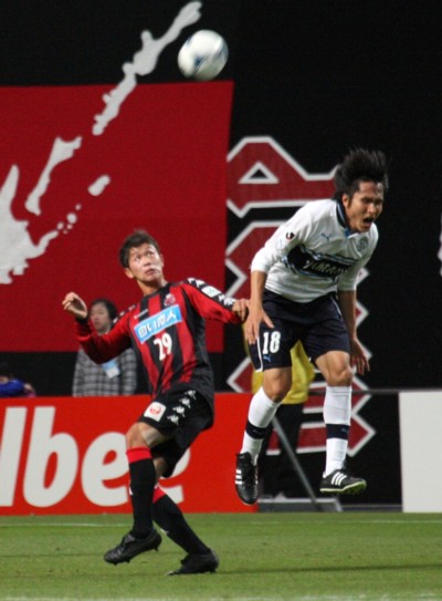 上写真/後半35分コンサドーレ札幌の左CKからの攻撃、新加入のDFノース(右端)が高い打点のヘディングでゴールを狙うもならず。中央はFWキリノ(19番)、その左、ジュビロ磐田のFW前田、左端DF駒野