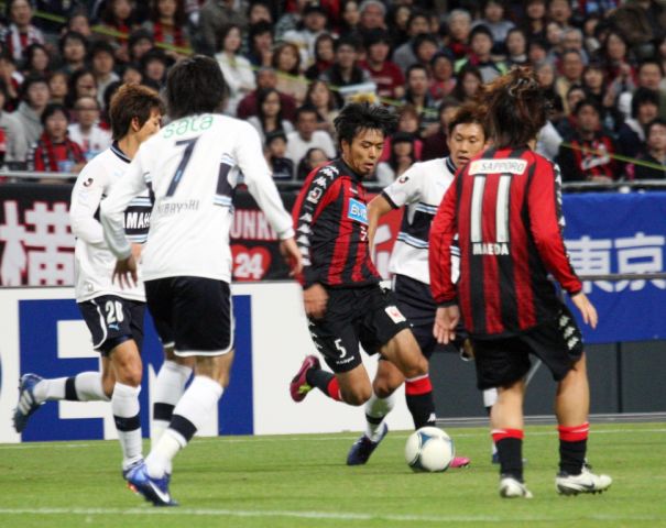 上写真/後半32分札幌の新戦力で先発出場を果たしたMF山本(5番)が積極的な攻め上がりを見せる。右手前FW前田(11番)
