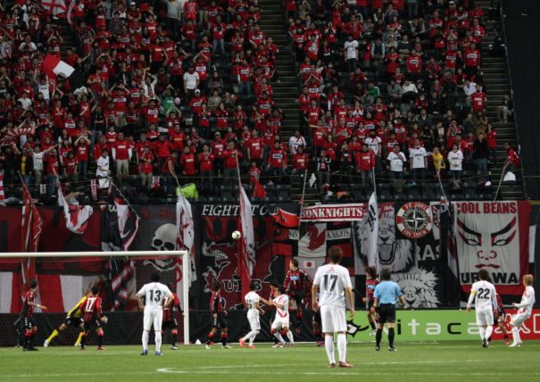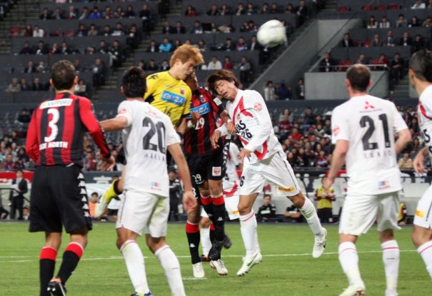 上写真/後半18分浦和のFKからの攻撃、前半ロスタイムに同点ゴールを決めたMF柏木(右端)のボールは、ゴール裏を埋めたサポーターが固唾を飲んで見守る中、壁を作ってジャンプする札幌DFノース(3番)の頭上を越え、逆転ゴールとなる