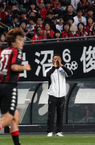 上写真/前半45分大声で指示を出す札幌の石崎信弘監督。ロスタイム1分を選手に知らせたのか? この直後に浦和MF柏木に同点ゴールを決められる