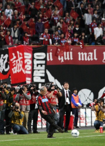上写真/「白い恋人」サンクスマッチとあって、キックインセレモニーをする石屋製菓の島田俊平社長