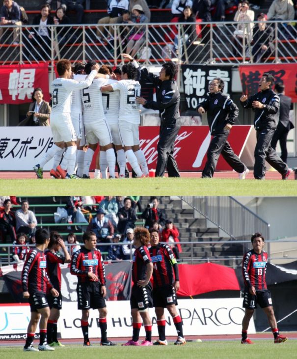 上:上段写真/後半38分ダメ押し点となった直接FKを決めたMF森崎浩(7番)を手荒く祝福して大喜びする広島の選手、スタッフたち