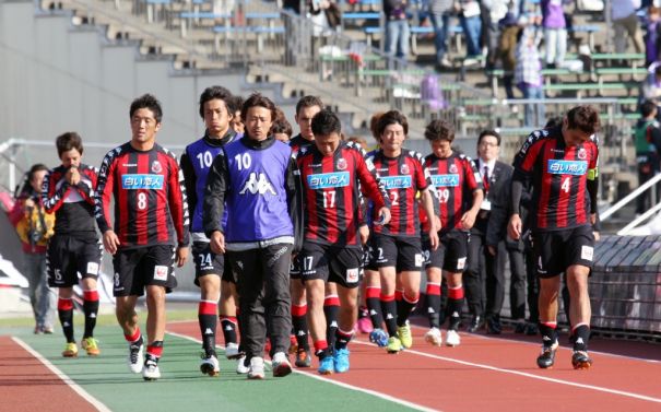 上写真/4連敗となり疲れ切った表情でサポーターへの挨拶に向かうキャプテンMF河合(右端)、古田(左端)ら、札幌の選手たち