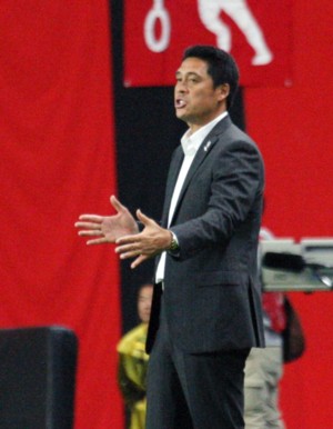 上写真/後半18分ごろピッチサイドで選手に指示を出すガンバ大阪の松波正信監督。3−0の展開に余裕十分に見えた